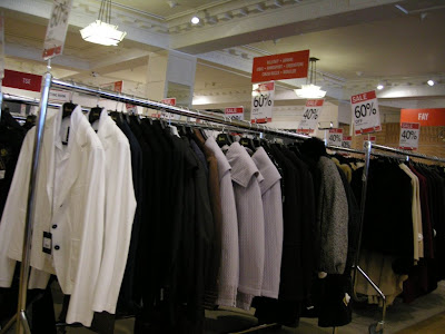 大折扣的關係吧,整個百貨裡面人聲鼎沸不說,連衣服陳列都亂七八糟,一點都沒有很高級的感覺。話雖如此,這些看起來像夜市擺設的衣服,便宜的也要三四千塊台幣哪!七八千的衣服這樣亂掛看起來就很廉價....