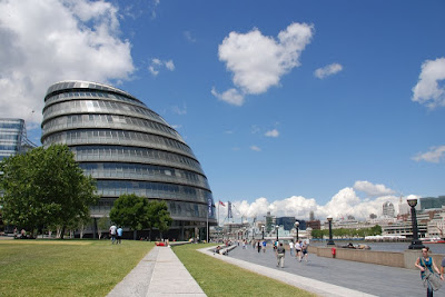 也很特別的30 St Mary Axe,又稱 The Gherkin 或 The Swiss Re Tower。本來逛完 Tower of London 以後是打算去這裡的,不過既然在河畔可以很清楚的看到「幾乎」整棟建築,加上其實走了這一段路腳也酸了想休息,就說服自己說:反正過去也拍不到整棟,還不如在這裡看得清楚哩~
